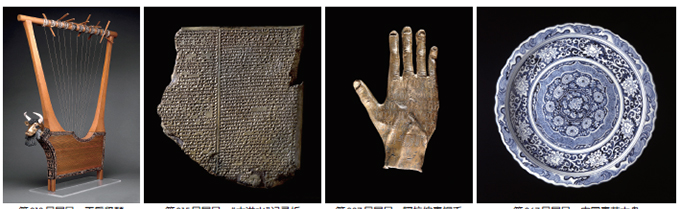 圖1:第013號(hào)展品 王后豎琴 圖2:第015號(hào)展品 “大洪水”記錄板 圖2:第037號(hào)展品 阿拉伯青銅手 圖2:第067號(hào)展品 中國(guó)青花大盤(pán)