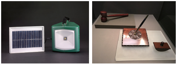 左圖:第100號(hào)展品 太陽(yáng)能燈具與充電器 右圖:第101號(hào)展品 宣布中國(guó)重返世貿(mào)組織的木槌和中國(guó)重返世貿(mào)組織的簽字筆