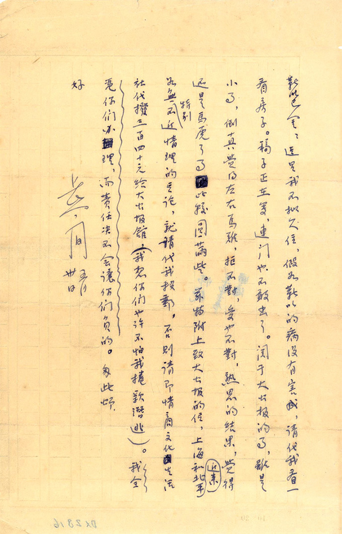 老巴:……另外一個問題,本來我在上海就想向你提出,但是想到你可能一句普通話,不加考慮,說過就忘記了。所以現(xiàn)在寫在這里,希望你認真考慮一下。本來你好幾年前已具備入黨條件,當時你自稱過慣了自由散漫的生活,怕給黨帶來不良影響,自己又怕太受拘束。你說這話是誠懇的,我完全相信??墒歉鶕?jù)你幾年來的工作與活動,事實證明并不自由散漫,你接受黨的命令工作生活,盡可能參加各種會議,有什么必要老留在黨外呢?請你自己認真考慮一下,和肖珊商量一下?!瓎柲銈兒貌⒆jH宅平安! 師陀 一九六六年四月廿四日