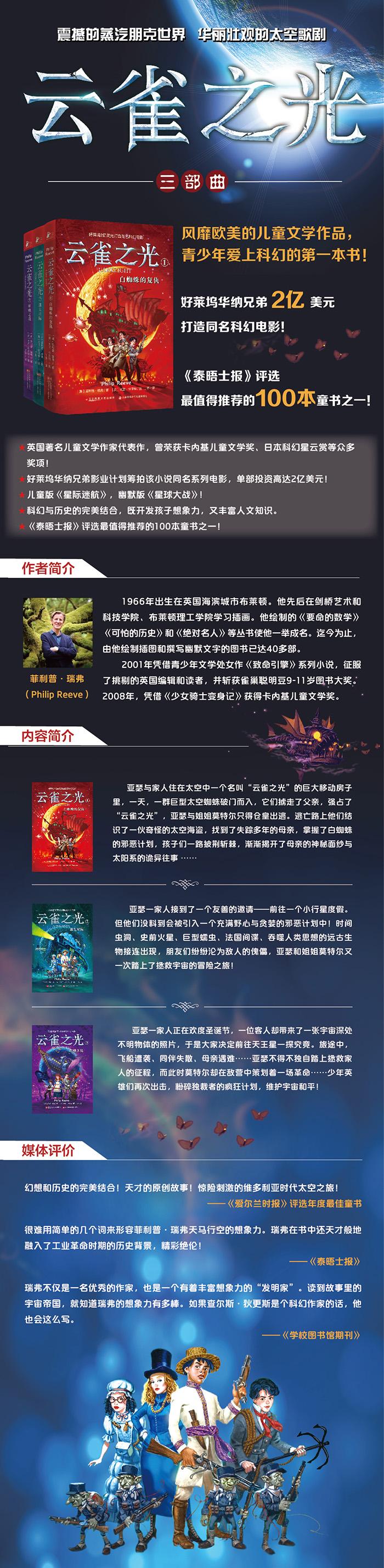 好萊塢2億美元打造同名科幻電影!《泰晤士報(bào)》評選值得推薦的100本童書之一。真實(shí)的歷史背景,震撼的蒸汽朋克世界,華麗壯觀的太空歌??!青少年愛上科幻的書!
