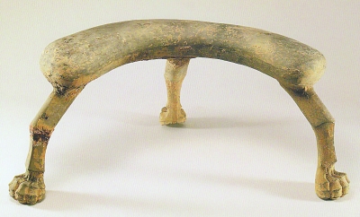 東晉南朝,曲憑幾流行一時,但考古所見主要是作為隨葬明器的陶憑幾。南京象山瑯琊王氏家族墓中,一件陶質(zhì)曲憑幾(下圖)安放在棺床前的陶榻上,雖然幾筵空置,卻令人聯(lián)想到幾乎是同時期遠在甘肅酒泉的墓葬壁畫中,墓主人褒衣博帶、憑幾閑坐的圖景。