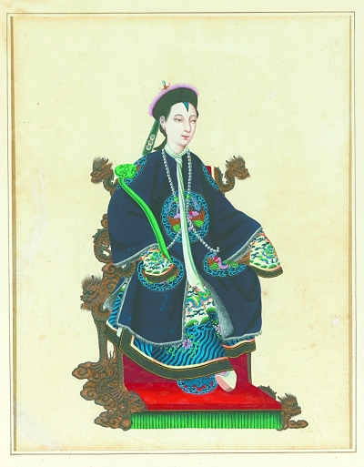 法國人不能確定這幅人物畫像的身份,甚至有人名之曰“中國皇后像”,從畫中各種服飾特征看,這根本不是皇后的裝束。實際上,在1901年以前,西方商人和使節(jié)也見不到中國皇宮中的后妃。畫像中很多細(xì)節(jié)特征并非完全捕風(fēng)捉影,但當(dāng)這些特征組合于一身時就顯得荒誕走形了。應(yīng)該說這是一幅想象中的中國貴婦人畫像,并非寫實。清代后妃和官員夫人們身著朝服袍褂時會佩戴三掛朝珠,畫像中只畫了左右兩肩斜戴的兩掛,缺了正中套在脖頸上的最重要的一掛。