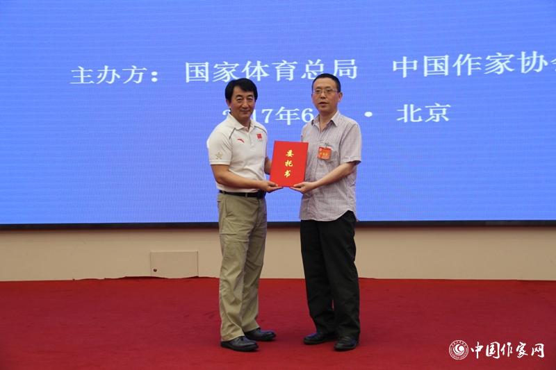 國家體育總局群眾體育司司長劉國永向作家關(guān)仁山(顧超代表)遞交創(chuàng)作委托書 中國作家網(wǎng) 超俠 攝