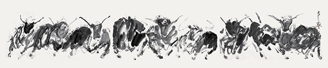 磅礴的生命力展現(xiàn)?!肮P性墨情,皆以其人之性情為本?!保▌⑽踺d《藝概》)真正的藝術(shù),是創(chuàng)作主體的人格寫照與生命展示。唐雙寧的狂草畫,具有強(qiáng)烈的抒情特征,以狂放的筆墨、不羈的造型,宣泄內(nèi)在的生命感受。所謂“作畫須有解衣盤礴,旁若無人,然后化機(jī)在手,元?dú)饫墙濉保ㄇ鍚翂燮剑?。唐雙寧的狂草畫創(chuàng)作多遂性而作,快意抒懷,若吐塊壘。興之所至,板刷、抹布乃至雞毛撣、拖把都被他用作寫意抒情的工具。他“筆”下的代表作《萬馬奔騰》巨幅系列長達(dá)數(shù)十米,如狂飆,如巨浪,如激箭,如纛陣,如洪流,如奔云,滿紙氤氳,滿耳嘶鳴,抒發(fā)的是充沛的生命力量、蓬勃的創(chuàng)作激情與深刻的人生感悟,給人以強(qiáng)烈的視覺沖擊與審美震撼。