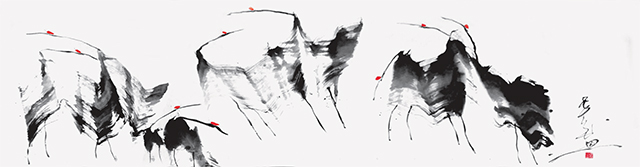有意味的形式創(chuàng)造。英國文藝批評家克萊夫·貝爾提出了“有意味的形式”理論,他說:“在各個不同的作品中,線條、色彩以及某種特殊方式組成某種形式或形式間的關(guān)系,激起我們審美感情。這種線、色的關(guān)系和組合,這些審美的感人形式,我稱之為有意味的形式?!庇幸馕兜男问?,是一切視覺藝術(shù)的共同性質(zhì),是藝術(shù)家創(chuàng)造能力的重要體現(xiàn),意味著敏銳的精神感受、概括、萃取與表達(dá)能力。唐雙寧的狂草畫創(chuàng)作,窺意象而運(yùn)斤,追求意象,講究寫神,妙在似與不似之間,在大寫意中創(chuàng)造有意味的審美形式與無垠的想象空間。他筆下的牛非全牛、馬也非馬,具象的寫意對象被解構(gòu)為抽象的點(diǎn)與線、飛白與色塊,而抽象的元素在他的重構(gòu)、驅(qū)使下,幻化為具有象征意味的藝術(shù)圖式與審美意象,帶給人廣闊的審美想象、獨(dú)特的藝術(shù)感受。