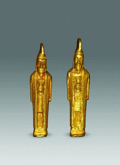 我們?yōu)橐恍﹣碜灾袊酝獾貐^(qū)的展品也配上了我館的藏品加以比照說明,這一部分以我館收藏的絲綢之路古代國家錢幣為主。比如第五十六號展品,來自印度的濕婆和雪山神女像,我們就配上了館藏的貴霜王朝波調(diào)一世金幣,顯示了貴霜王朝時期濕婆信仰在中亞地區(qū)的影響。又比如第四十三號展品:阿卜杜勒·馬利克金幣,這種由阿卜杜勒·馬利克在七世紀(jì)創(chuàng)造的摒棄哈里發(fā)形象、僅以《古蘭經(jīng)》箴言文字作為裝飾的錢幣新樣式,一直沿用到二十世紀(jì)初。我們?yōu)樗渖狭损^藏的蒙古帝國成吉思汗金幣,雖然金幣是晚至十三世紀(jì)初鑄造的,但像這樣標(biāo)明大汗全名和制造地、年份等信息的金幣,極為罕見珍貴。又比如第二十五號展品:奧克蘇斯的瑣羅亞斯德教徒像,我們就配上了館藏的安息王朝阿薩西斯一世銀幣,銀幣年代晚于教徒像,我們想通過銀幣上安息帝國國王頭戴的風(fēng)帽,展示塞族人的風(fēng)帽→教徒像上的風(fēng)帽→安息國王頭上的風(fēng)帽這樣一條影響鏈條,最終說明塞族人文化對伊朗高原的影響。