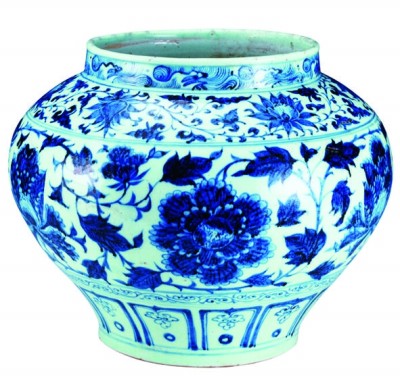上博:是的。再比如第六十七號展品:元青花盤,形制規(guī)整精巧,花紋繁復(fù)縝密,色彩幽菁可愛,是元青花瓷器中的精品。但是如果記性好一點(diǎn)的觀眾就會發(fā)現(xiàn),大英博物館的這件元青花盤在2012年上海博物館舉辦元青花瓷器大展時就已經(jīng)來過上海了,此次再來,可見其在大英博物館中的重要地位。我們配上了館藏的元青花纏枝牡丹紋罐,相比之下,呈現(xiàn)的是相對活潑的風(fēng)格。