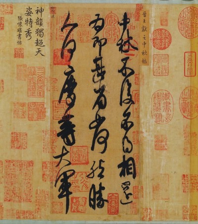 《快雪時晴帖》 是晉朝書法家王羲之的書法作品,以行書寫成,紙本墨跡?!犊煅r晴帖》 是一封書札,其內(nèi)容是作者寫他在大雪初晴時的愉快心情及對親朋的問候,收藏于臺北故宮博物院。王獻(xiàn)之 《中秋帖》 又名《十二月帖》,以草書寫成,現(xiàn)存北京故宮博物院。王珣 《伯遠(yuǎn)帖》 以行書寫成,現(xiàn)藏于北京故宮博物院?!吨星锾?和 《伯遠(yuǎn)帖》 在清末溥儀出宮時被帶出紫禁城,后來輾轉(zhuǎn)流傳在外,1950年購回交與北京故宮博物院收藏。