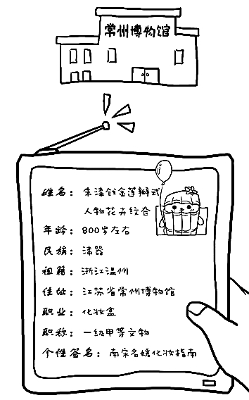 小女子來自江蘇省的常州博物館,是用漆樹的汁液涂在器物的表面制成的器物,身份證上名叫“南宋朱漆戧(音“嗆”)金蓮瓣式人物花卉紋奩”。這么復(fù)雜的名字是文物專家們?yōu)榱藴蚀_描述我的特征而取的全名。起這種又長又難讀的名字,上課老師提問一定不會點到我吧?