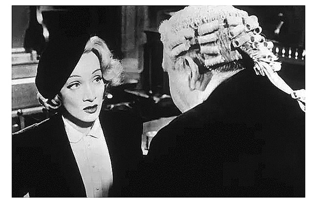 《控方證人》的結(jié)局,可以說“非常瑪琳·黛德麗”,但是“不怎么比利·懷爾德”。片中弗蘭倫夫人設(shè)定是56歲,演員實際年齡59歲。而看上去人近中年、仍然風姿綽約的黛德麗,時年正是56歲。如果對她不了解,在黑白光影的曖昧掩飾下,只看片中的形象很難有人想到她已經(jīng)如此高齡。從《日落大道》到《麗人劫》,懷爾德一貫對年長如斯的女人苛刻之至,她們總是扭曲而可怖的,更不要說表達某種敬佩之意了,從這一點看克里斯汀·沃爾的確是一個“不同凡響的女人”。