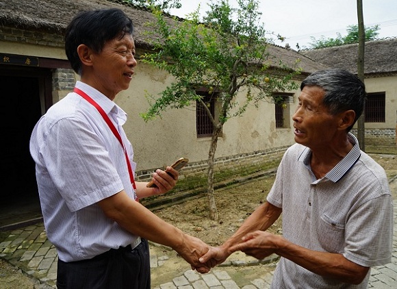 文昌宮不遠(yuǎn)處,便是淮海戰(zhàn)役總前委指揮部的另一處舊址——小李家。小李家是當(dāng)時(shí)濉溪縣的一戶姓李的人家。13日,采訪團(tuán)到小李家的時(shí)候,一位叫李松林的老人正在院子里打掃房屋,老人是這個(gè)房子的老房東,當(dāng)時(shí)就是他的父親李光者主動(dòng)把房子讓給解放軍的?,F(xiàn)在的小李家已經(jīng)成為紅色革命根據(jù)地,每天都會(huì)有人前來參觀,李松林幾十年來堅(jiān)持在這個(gè)院子里為大家作義務(wù)講解。老人告訴大家,當(dāng)年劉伯承、鄧小平、陳毅從文昌宮轉(zhuǎn)移后,就在這里工作和生活?!拔腋赣H告訴我,鄧小平同志還抱過我呢,只是沒有留下照片。”老人說這句話時(shí),臉上露出憨厚而自豪的笑容?!拔乙残绽?,你們家曾為革命、為國家付出這么多,是咱們李姓的驕傲”,團(tuán)員李西岳與老人緊緊地握著手說。