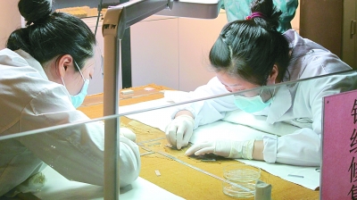 新疆博物館文物科技保護(hù)中心技術(shù)部工作人員馬葉楨(右)和同事在給我——黃色毛殘片“治療” 圖片為王一坤攝/光明圖片
