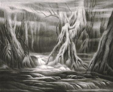 張弛的山水畫,汲取了東瀛水墨畫的養(yǎng)分,作品虛幻之境的獲得,在很大程度上來(lái)自“水暈?zāi)ぁ钡倪\(yùn)用,反復(fù)渲染,使作品形成了層次豐富又統(tǒng)一的調(diào)性,這是中國(guó)畫不太具備的一種藝術(shù)品質(zhì)。同時(shí),她繼承了中國(guó)畫講究筆性的藝術(shù)特征,大塊面的點(diǎn)子皴和描寫根須與坡石的折帶皴,不僅與多調(diào)性的渲染融為一體,而且賦予畫面以幽深微茫的山水意境。