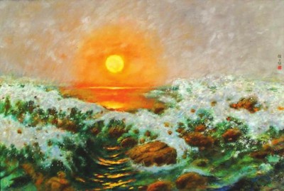 名為 《祖國頌》 的美術(shù)作品,至少有一幅國畫與一幅油畫堪稱經(jīng)典。其中,經(jīng)典國畫《祖國頌》 出自齊白石,既能代表藝術(shù)家大寫意花鳥的最高水平,也算得上新中國紅色經(jīng)典藝術(shù)的開山作之一。1954年創(chuàng)作這幅作品時(shí),白石老人已逾90歲高齡。高2.18米、寬0.725米的巨幅畫作中,所繪內(nèi)容有著藝術(shù)家一以貫之的簡潔,只有一株松柏、一輪紅日、一只仙鶴、一汪湖水、一方巖石。這些事物的組合卻不簡單,不僅僅是美好寓意的累加,也不單單讓畫面巧妙擁有黃金分割般的比例,筆觸流淌出的更是一種神清氣爽、暢快自由,那是藝術(shù)家心情的真實(shí)表達(dá)。經(jīng)典油畫 《祖國頌》 出自顏文樑。與齊白石的同名畫作一樣,一輪紅日依然是畫面中牽引人們視線的焦點(diǎn)。這輪從海平面上一躍而出的紅日,極盡寫實(shí)的油畫技法則又予人身臨其境之感。畫面令人不禁聯(lián)想起莫奈的名畫 《印象·日出》,畫中氣魄卻又讓人不免吟誦起蘇軾的名句“大江東去,浪淘盡,千古風(fēng)流人物……”