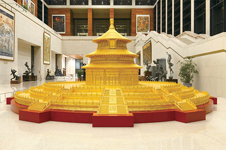 此次入藏國(guó)博的這件天壇祈年殿模型,是陳麗華于20世紀(jì)90年代聘請(qǐng)趙崇茂、樸學(xué)林、王仲杰等故宮老專家多次到現(xiàn)場(chǎng)勘察設(shè)計(jì),選用珍貴的緬甸柚木,由幾十名高級(jí)技術(shù)工人耗時(shí)三年多純手工制作的,并在表面手工貼了三層24K99金箔,模型通體金碧輝煌、美輪美奐。模型完全以原建筑物為準(zhǔn),采用中國(guó)傳統(tǒng)的榫卯結(jié)構(gòu)以1:10的比例精心雕制而成,直徑9米,高3.8米,各部件嚴(yán)絲合縫卻又能拆裝自如,工藝考究、一絲不茍,具有很高的藝術(shù)價(jià)值和收藏價(jià)值。模型再現(xiàn)了祈年殿的古風(fēng)原貌,可使觀眾近距離欣賞到中國(guó)古建筑藝術(shù)和木雕藝術(shù)之美,也展現(xiàn)了中國(guó)紫檀博物館在木雕藝術(shù)上的造詣傳承。