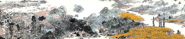 長(zhǎng)江是母親河,長(zhǎng)江經(jīng)濟(jì)帶的提出預(yù)示著這里將是我國(guó)發(fā)展戰(zhàn)略的重要依托。因此,創(chuàng)作長(zhǎng)江題材作品的使命,使何家安產(chǎn)生了強(qiáng)烈的創(chuàng)作沖動(dòng)。他于2013年開始動(dòng)筆,多次沿江徒步寫生收集素材,耗時(shí)5年完成了長(zhǎng)105米、高1.25米的巨幅長(zhǎng)卷。畫作西起金沙江源頭,東至上海吳淞口,用精湛的筆墨重點(diǎn)刻畫了重慶、武漢、南京、上海等城市,同時(shí)還描繪了三峽大壩、長(zhǎng)江大橋等現(xiàn)代建筑,使這一繪畫題材有了鮮明的時(shí)代特征?!堕L(zhǎng)江新卷》既有千山萬(wàn)壑、山重水復(fù)、咫尺天涯之意趣,又有筆精墨妙、酣暢淋漓之痛快,充分體現(xiàn)出畫家豐富的生活積累和深厚的傳統(tǒng)功力。本次展覽共分為兩部分,除展出《長(zhǎng)江新卷》外,還展出了藝術(shù)家近期的部分作品。