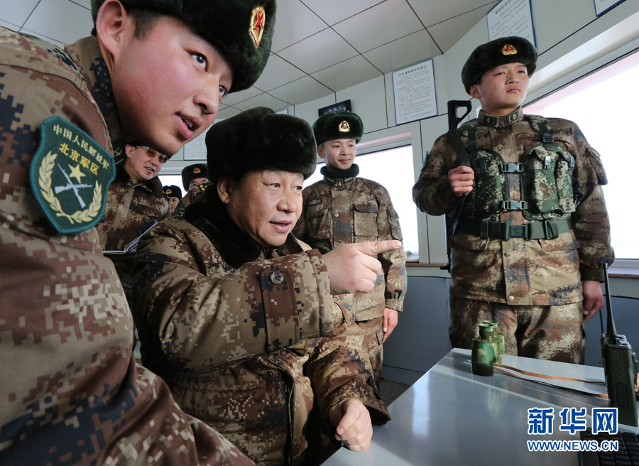 2014年1月26日,習(xí)近平專程來到內(nèi)蒙古軍區(qū)邊防某部,親切看望慰問戍邊官兵。這是習(xí)近平仔細察看三角山哨所執(zhí)勤設(shè)施,動情地對執(zhí)勤哨兵說:“今天,我和你們一起執(zhí)勤站崗。” 新華社記者 李剛 攝