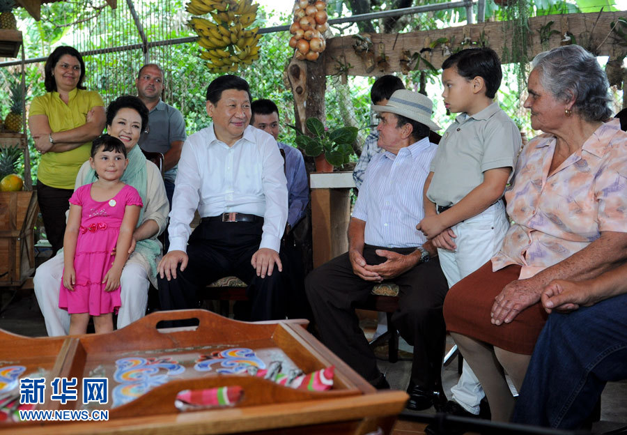 2013年6月3日,習(xí)近平和夫人彭麗媛走訪哥斯達黎加埃雷迪亞省圣多明哥小鎮(zhèn)農(nóng)戶薩莫拉一家,與薩莫拉一家人親切交流。 新華社記者 張鐸 攝