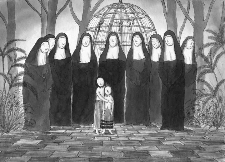 “關(guān)上身后粗重的大門,我聞到了一股不同于修道院的氣息,冷冽的風(fēng)讓我為自己從門后走了出來而感到震驚,然而一切為時已晚。街道很長,平緩的上坡,盡頭處能看到教堂尖塔的一角。邁步走進(jìn)外面的世界之前,我發(fā)覺自己很久之前就不再是小女孩了。街上空無一人,只有兩只瘦狗,一只跟在另外一只屁股后面聞著。”