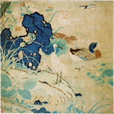 朱克柔 《緙絲蓮塘乳鴨圖》 是現(xiàn)存宋代緙絲畫作中的上乘之作,它出自名家之手,流傳有序,且幅式巨大,絲絲縷縷皆勻稱適宜、層次分明。圖中紅葉白鷺,綠萍翠鳥,蜻蜓草蟲,雙鴨游樂,畫面生動(dòng)活潑,色彩富有變化。青石處有緙織隸書小款“江東朱剛制 蓮塘乳鴨圖”,下有“克柔”印一方。