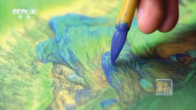 ▲中央美院的老師馮海濤在多年研究后用兩個(gè)月復(fù)制了十分之一的《千里江山圖》卷。他在節(jié)目中還原王希孟作畫步驟,告訴觀眾——中華民族一代代都有藏樸守拙的匠人。他們守護(hù)瑰寶。因?yàn)樗麄儯腥A文明經(jīng)五千年賡續(xù)不斷,有了鮮活寫照。圖為馮海濤復(fù)制十分之一《千里江山圖》卷的畫面。(節(jié)目截圖)