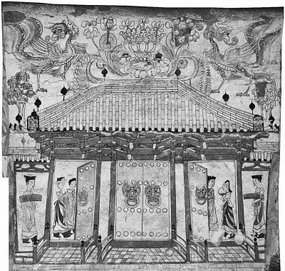 此次展覽中單體面積最大的一件展品是《忻州九原崗北朝壁畫墓墓道北壁壁畫》,它長(zhǎng)3.2米,高3.5米。壁畫中繪有一座規(guī)模宏大的木結(jié)構(gòu)建筑,建筑中華麗的門樓、廡殿頂、復(fù)雜的斗拱、重復(fù)的額枋、特殊的瓦釘、彩色的鋪地磚,建筑中的一磚一瓦都生動(dòng)、逼真,特別是雙柱式的斗拱在以往的資料中未曾見過。這是首次在同時(shí)期墓葬壁畫中發(fā)現(xiàn)木結(jié)構(gòu)建筑,讓我們有幸第一次在壁畫中領(lǐng)略北朝建筑的風(fēng)采。