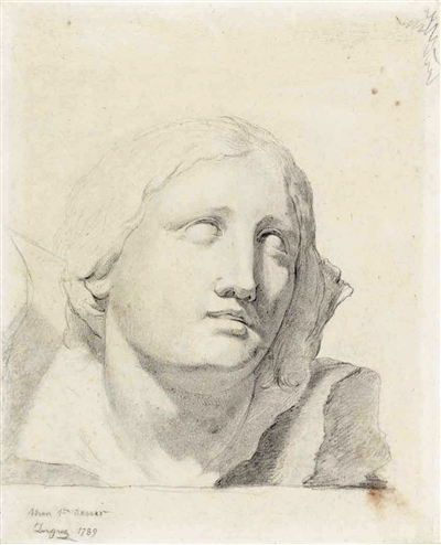 1780年,安格爾出生于法國南部的蒙托邦。從六歲開始,他就隨裝飾雕刻家父親學(xué)習(xí)繪畫和小提琴。九歲時(shí),安格爾開始接受正規(guī)的石膏素描訓(xùn)練,這幅作品就是現(xiàn)存他人生中第一幅畫。這幅畫描繪的是尼俄柏的石膏頭像。尼俄柏是希臘神話中底比斯國王安菲翁的妻子,她生了七個(gè)兒子和七個(gè)女兒,她因此驕傲,阻止底比斯婦女向勒托獻(xiàn)祭,被激怒的勒托叫阿波羅與阿爾忒彌斯把她的七個(gè)兒子和七個(gè)女兒都?xì)⑺懒?,安菲翁也自刎而死。傷心的尼俄柏化為石像,永遠(yuǎn)流著悲傷的眼淚。