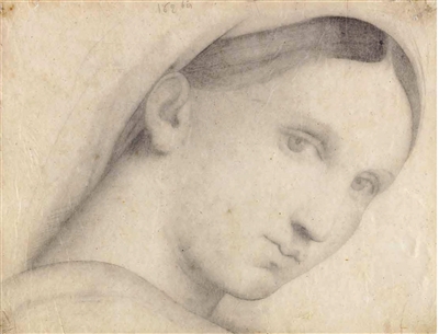 安格爾非常崇拜意大利文藝復(fù)興藝術(shù)家拉斐爾,他曾感嘆,要是早出生300年就好了,那樣他就可以成為拉斐爾的弟子了。安格爾大半生都在臨摹以及讓自己的學(xué)生臨摹拉斐爾。這幅《椅子上的圣母》草稿臨摹自拉斐爾創(chuàng)作于1514年的《椅中圣母》。拉斐爾原作中展現(xiàn)了圣母、圣嬰和約翰三個(gè)形象,但是安格爾在這幅草稿中只臨摹了圣母頭像。