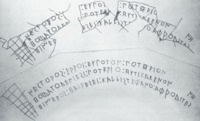 這個杯子上有三行銘文,銘文是片段的,因?yàn)楸拥囊恍┧槠瑏G失了。它用希臘字母的埃維亞早期形式寫成,從右到左分為三行,意思如下: