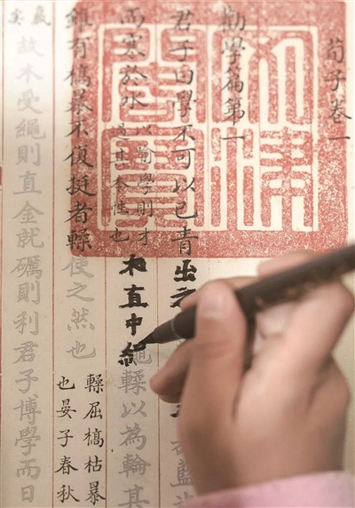 小學(xué)生受邀體驗(yàn)臨摹四庫(kù)底本的《荀子·勸學(xué)》 攝影/新華社記者 殷剛