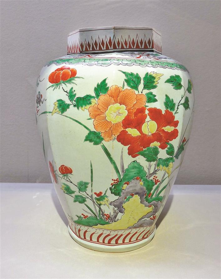 佐賀誕生的“有田燒”,最具代表性的是酒井田喜三衛(wèi)門(mén)的“柿右衛(wèi)門(mén)”赤繪。初代“柿右衛(wèi)門(mén)”由來(lái)說(shuō)法不一。有說(shuō),因作品使用了柿色,而獲“柿右衛(wèi)門(mén)”之稱(chēng);另說(shuō),因?yàn)橛么杀P(pán)裝柿子獻(xiàn)給藩主,獲賜“柿右衛(wèi)門(mén)”之號(hào)。赤繪技術(shù)據(jù)說(shuō)是從長(zhǎng)崎海商那里得到的。即在陶瓷之器面上,涂以釉藥,燒至攝氏千度以上,產(chǎn)生柔和的白色“濁手”后,再以各種顏色之釉,繪于器面,再改用低溫?zé)?,產(chǎn)生赤繪之瓷?!笆劣倚l(wèi)門(mén)”除了赤色之外,還使用綠、黃、紫、青之色釉,亦有用金銀者,稱(chēng)“錦手”或“金襕手”。這種誕生于1644年的赤繪,后來(lái)成為“有田燒”的標(biāo)志。初代“柿右衛(wèi)門(mén)”的作品,如今只能在大阪市立東洋陶瓷美術(shù)館這樣的博物館中才能見(jiàn)到,如眼前這兩件“赤繪草花紋瓶”、“五彩牡丹椿紋八角瓶”。