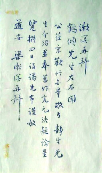 漱溟拜靜生總長(zhǎng)閣下:邇聞蔡鶴傾先生蒞京,未審寓居何所。元年嘗一晤于國(guó)務(wù)院,恐不省憶矣。茲思詣?wù)劊簇す痪}作介,并希示知寓址,為感。小事干冒,悚愧無(wú)量。伏問(wèn)政祺。梁漱溟再拜(1916年)