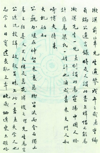 束冥先生惠鑒:手示敬悉,自退直歸,籀讀著論一過(guò),立誼審諦,罙達(dá)理要,欽遲何似。承仕學(xué)術(shù)亡似,辨智不周,雖嘗獲事大師,得聞勝誼,間亦涉獵佛乘,樂(lè)觀慈氏世親之書(shū),迫于人事,未嘗為深沉之思,疑殆尚多,卒未窺其究竟,又于大秦驢唇之文素所不習(xí),遠(yuǎn)西哲人所說(shuō),未能諷籀,無(wú)以和會(huì)東西,校其□劣。(1910年代)