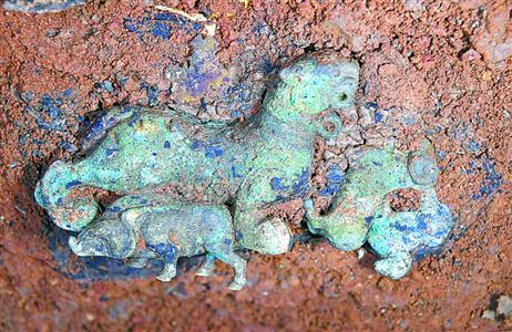 李存信介紹說(shuō),現(xiàn)階段清理出的馬蹄金共兩塊,分別位于墓主身側(cè),體量較小,正好可供孩童握在手中。青銅小罐不足十公分,推測(cè)是用來(lái)盛放水或者砂石進(jìn)行玩耍的。還清理出一個(gè)裝著4件微型青銅獸的盒子,盒子已破損嚴(yán)重,青銅獸分別為虎、大角羊、野豬、綿羊;其中虎型青銅獸疑似為漢代玩具車,虎爪下有輪,虎脖子下方有孔可穿繩,可供人力牽引。
