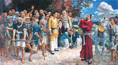 《田橫五百士》取材于《史記·田丹列傳》。作品表現(xiàn)的是田橫與五百壯士離別時的場景,悲壯氣概撼人心魄。畫中身披紅袍的田橫拱手抱拳,氣宇軒昂,向送別人群致意。畫中的男女老幼構成悲憤難當?shù)漠嬅婀?jié)奏,匯成一種英雄主義氣概。從1928年至1930年,徐悲鴻用3年時間完成這幅巨作,意在通過田橫故事,借古喻今,希望中華民族仍有這種不屈不撓的精神,啟迪國民振作精神,復興中華。