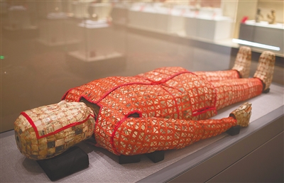 《秦漢文明展》此次展出了20余件南越王漢墓出土文物,展現(xiàn)了秦漢文明的多元。其中西漢南越王博物館的鎮(zhèn)館之寶“絲縷玉衣”引人矚目,用2291片玉石,以絲線穿系和麻布粘貼編綴而成的絲縷玉衣總長1.73米,是我國迄今所見年代最早、形制完備的玉衣。出土時,南越王尸體已經(jīng)朽爛,玉片也散落在地,專家耗費3年多時間才將其修整復原。