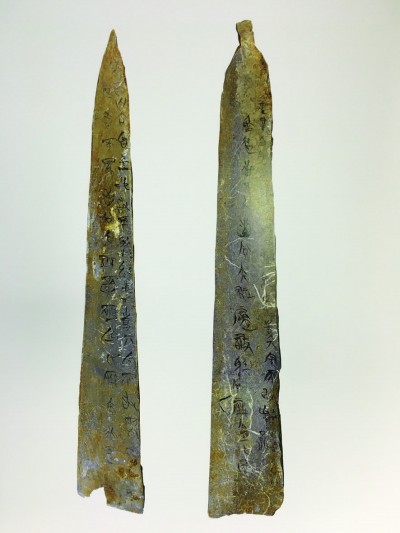 在鑒壺旁,擺了一組山西出土的“侯馬盟書”及河南出土的“溫縣盟書”,都是當(dāng)時晉國卿大夫之間舉行盟誓用誓詞。展覽說明寫道:“據(jù)《春秋》記載,242年內(nèi)諸侯國之間朝聘盟會多達450次,反映了諸侯國之間、公室與卿大夫之間、卿大夫相互之間,為重新劃分利益訂盟誓而破壞原有禮制的事實?!瘪R今洪說,春秋時期經(jīng)常會盟,通常召集人即是盟主,盟主就是“老大”,最為人熟知的五個“老大”是春秋五霸。訂盟書的意義在于規(guī)定利益邊界,主要是為了盟主的利益,“老大吃肉,小弟喝湯”。