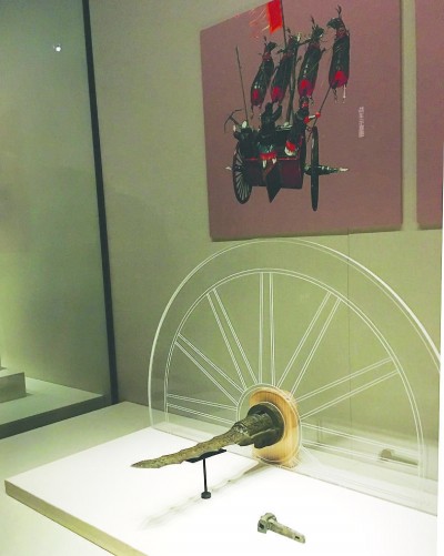 繞到下一個展廳,只見一個模擬的半個戰(zhàn)車車輪的車軸位置,豎插著一把劍似的物件?!斑@就是當(dāng)年的‘大規(guī)模殺傷性武器’?!毙芙ㄈA介紹,這是戰(zhàn)車上的矛狀車軎,1978年出土于湖北隨縣曾侯乙墓。矛狀車軎在使用時,軎轄朝上,矛葉與地面平行,在戰(zhàn)車行進時,可殺傷車旁之?dāng)?。“在?zhàn)國時代,為提高戰(zhàn)斗力和殺傷力,各類兵器與防御裝備都在迅速改進?!?/p>