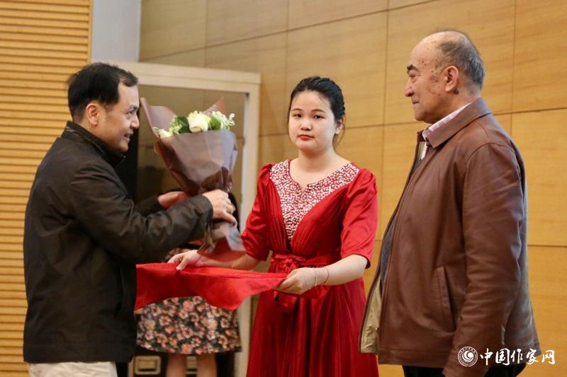 石一寧為獲獎作家伊明·艾合買提頒獎