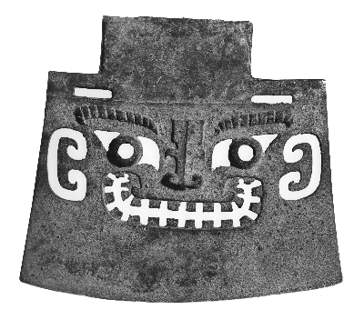 商周時(shí)期的青銅器極少只有人頭紋飾而沒(méi)有軀體的,而這兩件銅鉞僅透雕有猙獰怪神的頭部,其目的應(yīng)該是起到一種震懾的作用。類(lèi)似的青銅鉞在河南西周時(shí)期的墓葬中也有發(fā)現(xiàn),收藏家陳仁濤將其解讀為戰(zhàn)神蚩尤紋。雖然此說(shuō)法尚需考證,但由此我們可以知道,“鉞”和戰(zhàn)爭(zhēng)有著緊密的聯(lián)系。