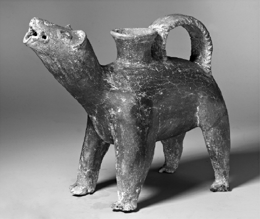 鬶是新石器時代流行的炊、飲兩用器具,由于當時的人們已掌握了火的使用方法,因此創(chuàng)造了大量出此類陶制器具用以烹煮、加熱食物?!墩f文·鬲部》記:“鬶,三足釜也。有柄喙?!濒h,一般為三足空心陶制器型,可以用于燉煮羹湯或溫酒,食物做好后還可以作為餐具直接端上筵席。這件狗形鬶為四足,造型如一只昂頭翹尾、正在朝遠方吠叫的小狗,神形具備,十分生動可愛。狗的四個袋狀足部較高,是為方便加熱;狗后背上凸起的圓形瓶口狀部件為注水口;小狗微張的嘴部為器物的出水口,其頭部微微上揚,好似犬吠,使整體造型富有動態(tài),同時又可以防止加熱時器體內的水溢出;鬶的提手造型仿佛小狗向上卷翹的尾巴,設計得十分精妙。
