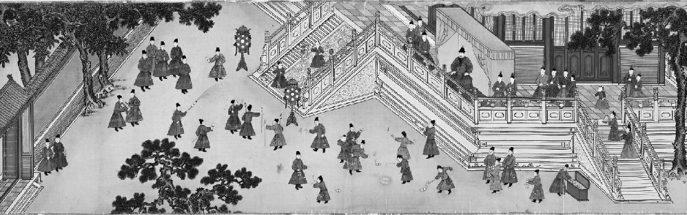 全幅畫卷可分三段來欣賞,每段由畫面中的宮苑紅墻分隔開來,分別描繪了內容不同的熱鬧慶祝場面。第一段中,憲宗坐在宮殿臺座上的黃色帷幔中,頭戴黑色便帽,身著青色繡金龍袍,正興致勃勃地觀看臺階下的太監(jiān)和男女童子燃放爆竹焰火。有人雙手捧著成串的爆竹;有童子用火捻正在點燃地上的爆竹;有膽小的孩童不敢放,雙手捂住耳朵躲到一旁;還有童子在太監(jiān)的指點下試著去點燃爆竹;有太監(jiān)手拿放煙火用的長桿,正欲燃放,觀畫者仿佛能夠感受到元宵夜絢爛的焰火在空中綻放的美麗和人們的歡笑喧鬧之聲,宮苑里熱鬧非凡。