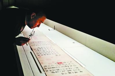張伯駒與潘素唯一愛女張傳綵在《王蜀宮妓圖》燈箱前駐足凝視。本報記者 李韻攝/光明圖片