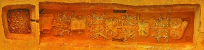 “故郡墓葬的車馬坑最值得一提?!睆埓洪L說,車馬坑在河北省本就罕見,至今發(fā)現(xiàn)也不過數(shù)座,而要論保存最佳,故郡車馬坑可拔頭籌。五輛車串排的陣列,漆彩貼金的車輿,華美絕倫的絡(luò)轡,代表了墓主人的尊貴身份。殉犬帶有項圈銅環(huán),體現(xiàn)了主人對車馬犬的珍視。宏大的規(guī)模是墓主人地位、財力和控制力的真實映射。“殉人現(xiàn)象和殉牲坑昭示著迥異中原的戎狄風(fēng)俗?!?/p>