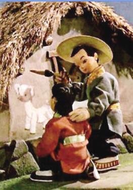 其次,原著中寫到統(tǒng)冶階級奪神筆時,先是財主,后為皇帝搶奪,其意固然在于使得矛盾沖突不斷激化,但也不免有故事情節(jié)的某些重復(fù)。洪汛濤對此作了刪除與改動,把財主與皇帝的暴虐行為集中在“大官”一人身上,這樣并不削弱原著的斗爭激烈程度,反而更加深了觀眾對統(tǒng)治者的印象。還有把原來搶寶遭懲的情節(jié)由兩次壓縮為一次,既精簡了篇幅,又顯得簡潔明了。