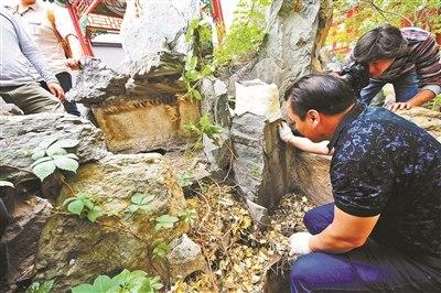 北青報(bào)記者在中式庭院內(nèi)看到,兩件文物位于亭子邊的假山石塊下,周邊種滿了花草,若不仔細(xì)尋找很難發(fā)現(xiàn)。乾隆御筆“熙春洞”石匾額只能清晰地看到“洞”字,另兩字很難辨清。而嘉慶御筆“稱松巖”已不完整,中間出現(xiàn)了兩三條裂縫。為了將兩件文物完整運(yùn)回圓明園,圓明園找了專業(yè)的文物搬運(yùn)公司。五六名工作人員先對(duì)“稱松巖”進(jìn)行搬運(yùn),借助各類工具小心翼翼地移開文物周邊的石塊和泥土,用特殊紙張將“稱松巖”頂部包裹,用膠帶緊緊綁住。接著,工作人員又用泡沫板進(jìn)行包裹,打上了綁帶?!熬拖襻t(yī)生給骨折病人打夾板一樣,由于這塊石刻已經(jīng)風(fēng)化,我們先把頂部進(jìn)行捆綁,再?gòu)母柯似饋?lái)?!标愝x介紹。