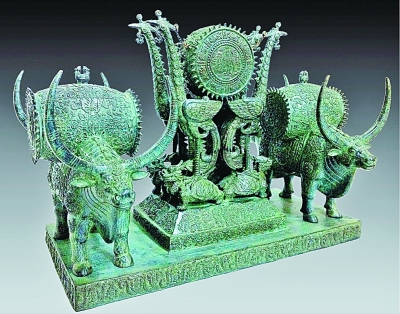 在展廳中央,一件青銅作品《歡樂鼓》引來不少觀眾駐足觀看?!稓g樂鼓》由貴州布依族工藝美術大師劉雍創(chuàng)作,由一個主鼓和兩個副鼓組合而成,主鼓懸掛在由四只鳳凰和四只龍頭龜構成的鼓架上,鼓的正面鐫刻著貴州的象征——黃果樹瀑布,鼓的背面是傳統(tǒng)的銅鼓圖案,鼓身上遍布著日、月、魚、龍等吉祥紋樣;鼓的周邊布滿了芒刺,借鑒于布依族傳統(tǒng)的主打樂器——刺鼓。兩個副鼓分別由兩只雙頭牛馱負,鼓和牛全身遍布著貴州特有的傳統(tǒng)民族圖案,強化了作品的民族特色。