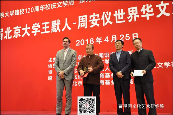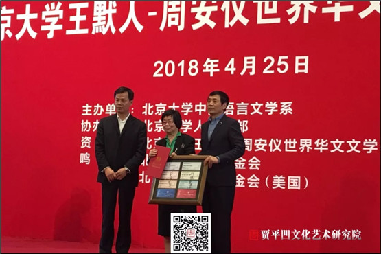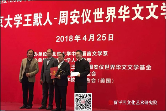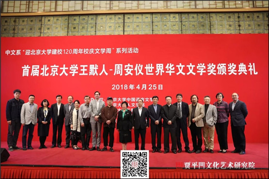 4月25日,為迎接北京大學建校120周年校慶,首屆“北京大學王默人-周安儀世界華文文學獎”頒獎典禮在北京大學英杰交流中心舉行。該獎項由美國華裔王默人和周安儀向北京大學捐資設立,由北京大學中文系主辦。中國作協(xié)副主席賈平凹長篇小說《極花》、馬來西亞作家黃錦樹短篇小說集《雨》榮獲評委會大獎,賈平凹文化藝術(shù)研究院應邀參加活動。