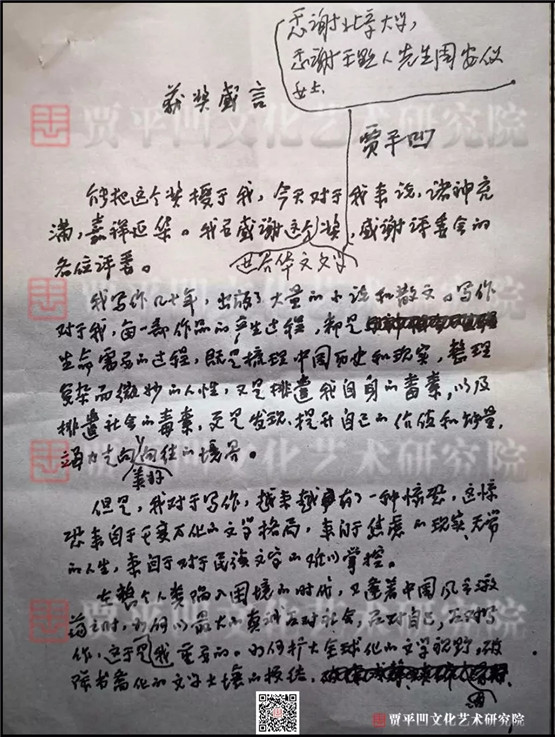 中國作協(xié)副主席賈平凹發(fā)表獲獎感言:能把這個獎授予我,今天對我來說,諸神充滿,嘉祥延集。我很感謝這個世界華文文學獎,感謝北京大學,感謝王默人先生周安儀女士,感謝評委會的各位評委。