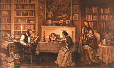 中央美術(shù)學(xué)院教授孫景波已經(jīng)74歲,是參與創(chuàng)作的畫家中最年長(zhǎng)的。他說(shuō):“我們這代人是在馬克思主義的信仰下成長(zhǎng)起來(lái)的。馬克思主義解放全人類,改造舊世界,建立世界大同的革命理想,是我所信仰和追求的。我年輕時(shí)讀馬克思傳記,了解到馬克思為實(shí)現(xiàn)推動(dòng)人類進(jìn)步孜孜以求的精神和馬克思家庭濃郁的親情人文氛圍。對(duì)此有著深厚的情結(jié)。因此這次創(chuàng)作,我主動(dòng)選擇畫馬克思一家人在書房里朗讀莎士比亞詩(shī)歌的場(chǎng)景,表現(xiàn)馬克思作為學(xué)者、詩(shī)人、丈夫、父親的一面。”孫景波的這幅《革命的一家人》,采用電燈發(fā)明之前、燭光的用光,充滿明暗虛實(shí)的神秘感和親情的溫馨,襯托出一個(gè)書香家庭詩(shī)的意境。場(chǎng)景選擇的時(shí)間節(jié)點(diǎn)是1865年,馬克思、夫人、長(zhǎng)女、二女兒和幼女全家相聚的時(shí)刻。